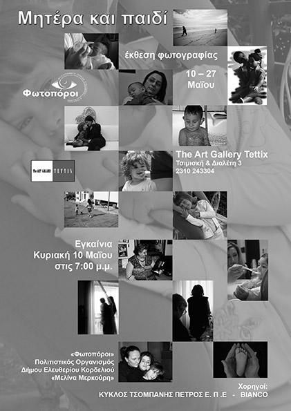 Ομαδική έκθεση φωτογραφίας της φωτογραφικής ομάδας «Φωτοπόροι» του Πολιτιστικού Οργανισμού του Δήμου Ελευθερίου Κορδελιού «Μελίνα Μερκούρη» με θέμα «Μητέρα και παιδί» θα πραγματοποιηθεί στην Art Gallery Tettix (Τσιμισκή & Διαλέτη 3, Θεσσαλονίκη) από τις 10 – 27 Μαΐου. Τα εγκαίνια θα γίνουν στις 10 Μαΐου, στην γιορτή της μητέρας.