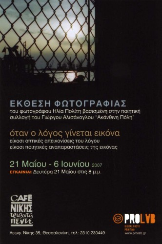 Είκοσι οπτικές απεικονίσεις του λόγου… Είκοσι ποιητικές αναπαραστάσεις της εικόνας. Μία έκθεση φωτογραφίας του Ηλία Πολίτη βασισμένη στην ποιητική συλλογή του Γιώργου Αλισάνογλου ΄΄Ακάνθινη Πόλη΄΄. Εικόνες της πόλης όπως την βλέπει και την αισθάνεται το μάτι ενός ανθρώπου που ζει και αναπνέει σ’ αυτόν τον τόπο, έχοντας ως συντροφιά και μοναδικό του όπλο την φωτογραφική του μηχανή. Σε κάθε του κλικ υπάρχει η διάθεση να δώσει μια άλλη οπτική στον κόσμο που τον περιβάλλει... Να φέρει στην επιφάνεια αυτό που δεν φαίνεται εκ πρώτης όψεως μέσα από τα άδυτα της καθημερινής ζωής του. Να δώσει έμφαση στο σημαίνον και στο σημαινόμενο! Εδώ αρχίζει ο λόγος. Ο λόγος της ποίησης είναι στενά συνδεδεμένος με την εικονοπλασία. Δεν ξέρουμε αν προηγείται ή αν έπεται. Άλλωστε από τις πύλες του ασυνειδήτου προέρχεται η καταγωγή και των δύο μορφών έκφρασης και είναι μάταιο να τις διαχωρίζουμε. Η προσπάθεια των δύο δημιουργών έγκειται ακριβώς σε αυτή την ενοποίηση των διαφορετικών μορφών τέχνης σε μια.
